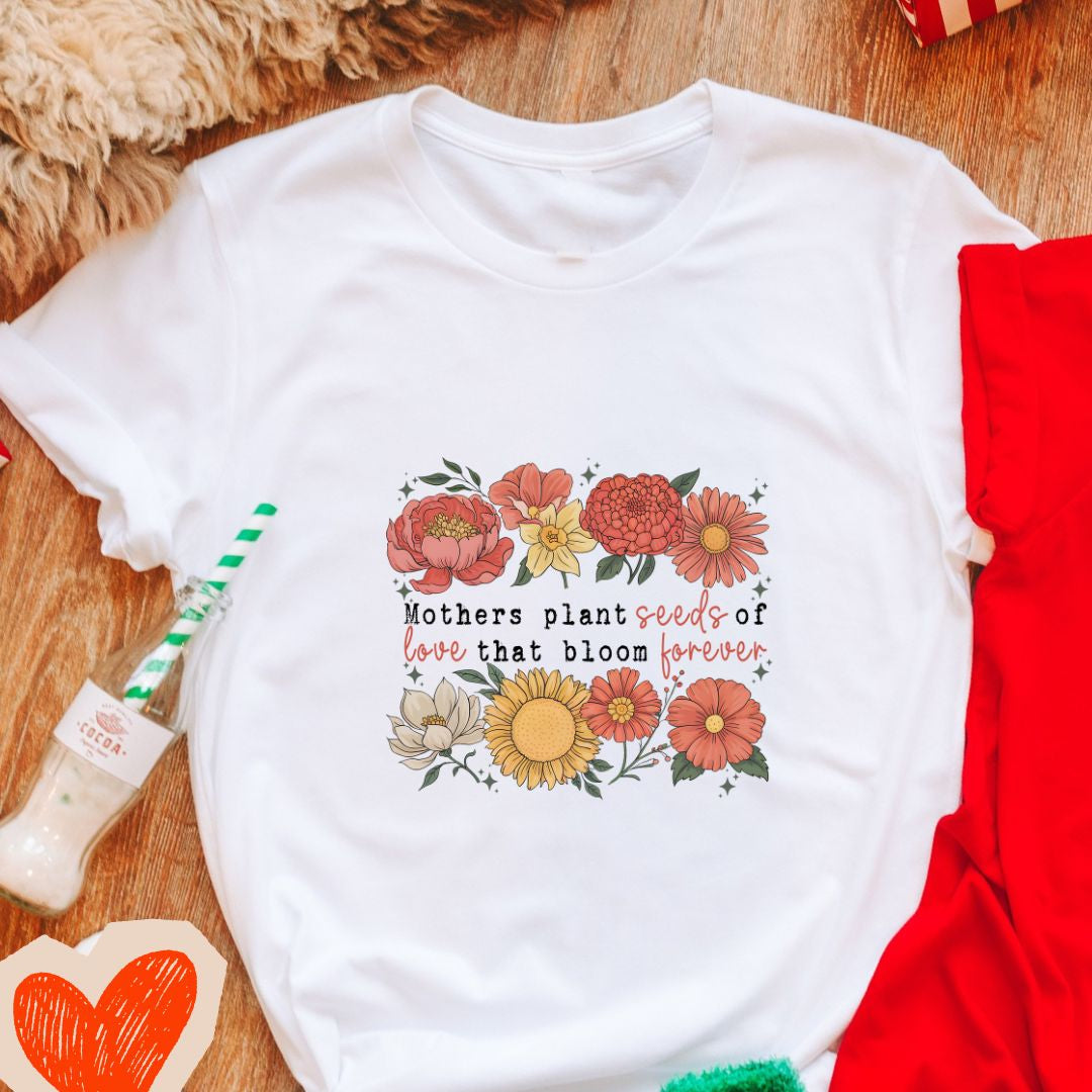 Design Inspiration: A stunning botanical composition featuring delicate flowers in full bloom—perhaps roses, peonies, wildflowers, or a garden medley—gracefully arranged around or beneath the meaningful text. The typography "Mother Plants Seeds of Love That Blooms Forever" flows in an elegant script or modern serif font, perfectly integrated with the floral elements. The design might feature watercolor-style flowers in soft pastels (blush pink, lavender, sage green, cream), vintage botanical illustrations, or contemporary floral line art. The overall aesthetic is feminine, timeless, and deeply emotional—creating a piece that feels both artistic and profoundly personal.