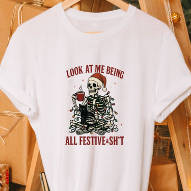 - Features the hilariously blunt phrase “Look at me all festive and shit” paired with a festive (or at least trying to be) skeleton graphic.