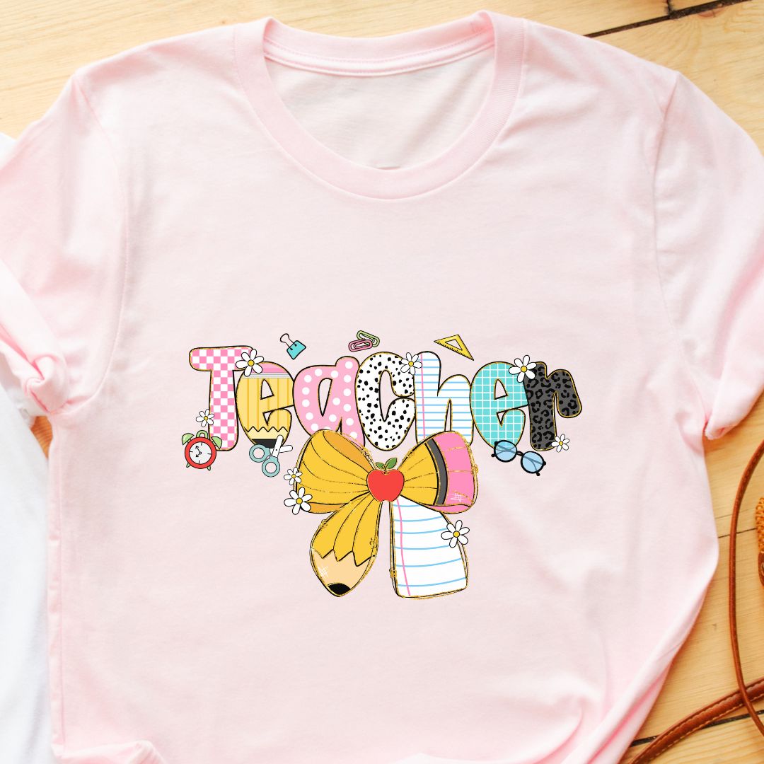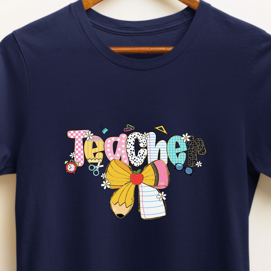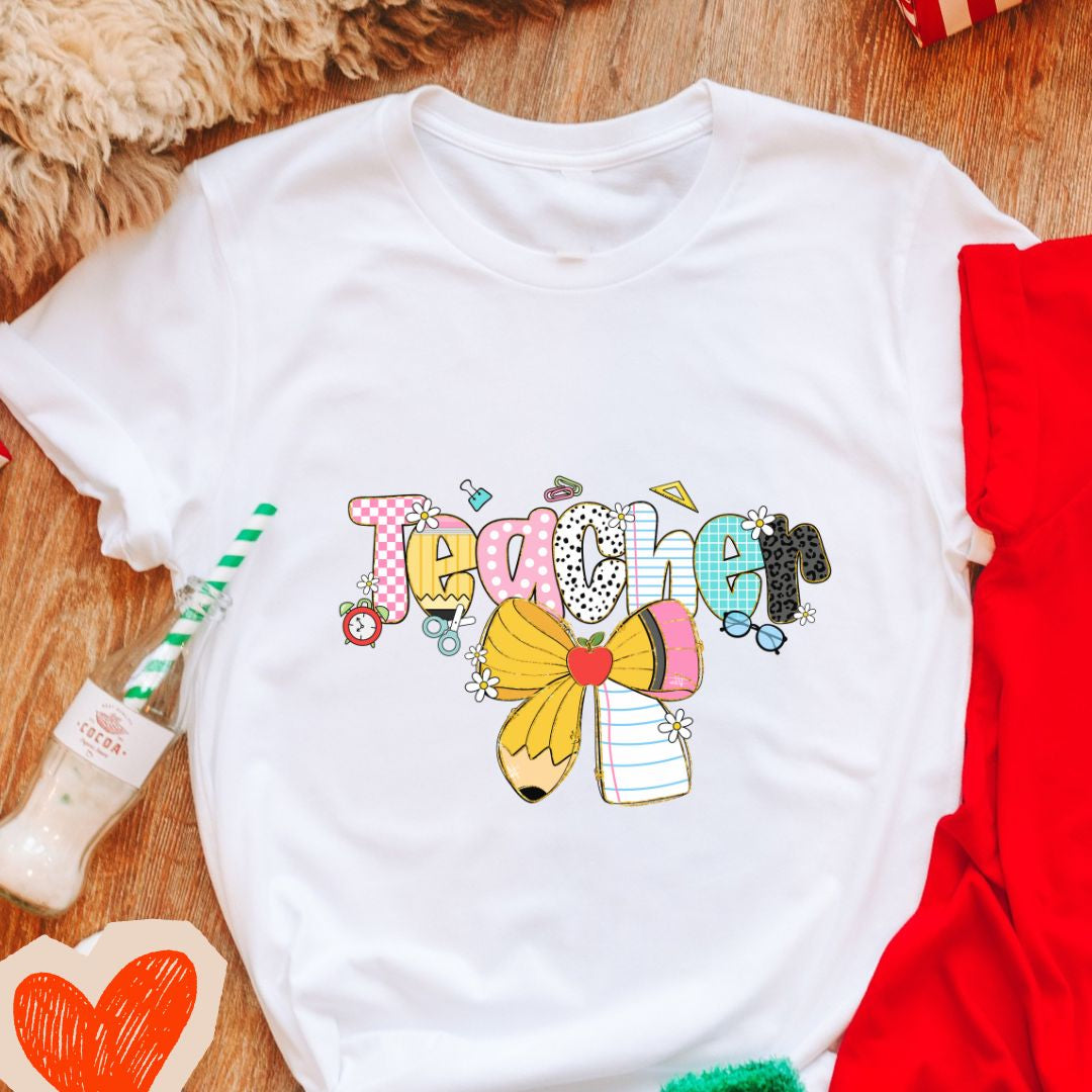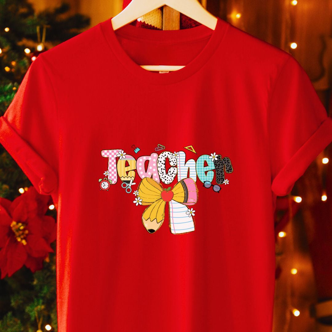 A sweet, playful nod to the classroom — this "Teacher" t-shirt features a charming pencil tied with a delicate bow, designed especially with female teachers in mind. It blends professional warmth with a touch of feminine style, making it a perfect everyday tee for teaching, meetings, or casual school events. Thoughtful enough for Teacher Appreciation Week, yet stylish enough for everyday wear.