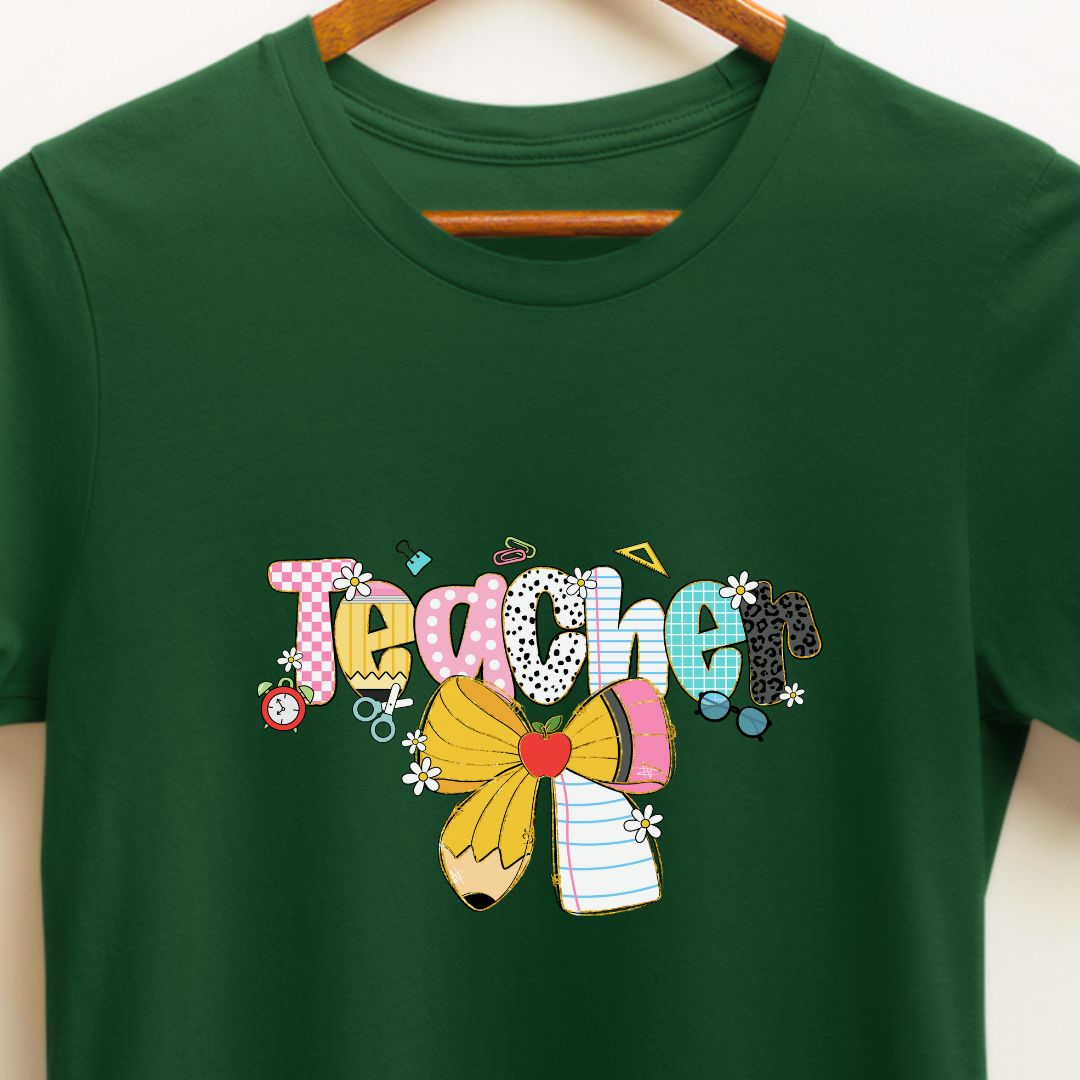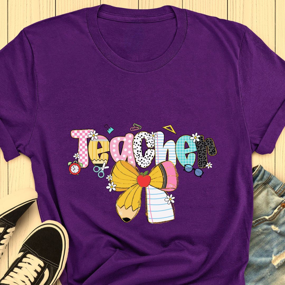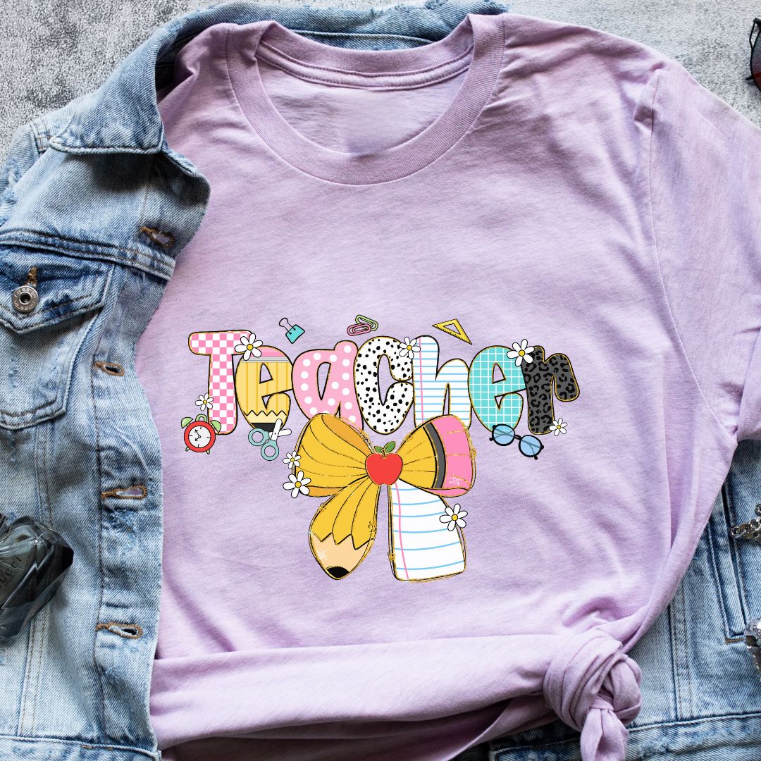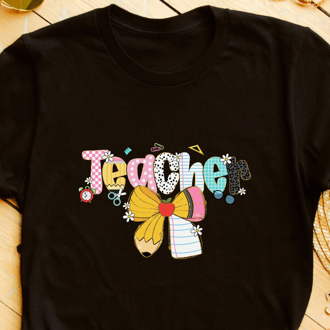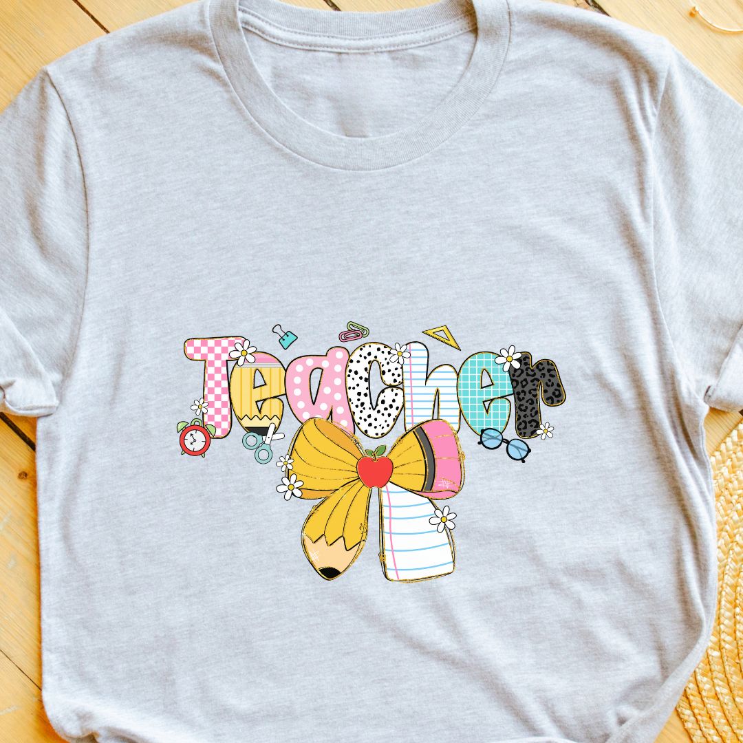 A sweet, playful nod to the classroom — this "Teacher" t-shirt features a charming pencil tied with a delicate bow, designed especially with female teachers in mind. It blends professional warmth with a touch of feminine style, making it a perfect everyday tee for teaching, meetings, or casual school events. Thoughtful enough for Teacher Appreciation Week, yet stylish enough for everyday wear.