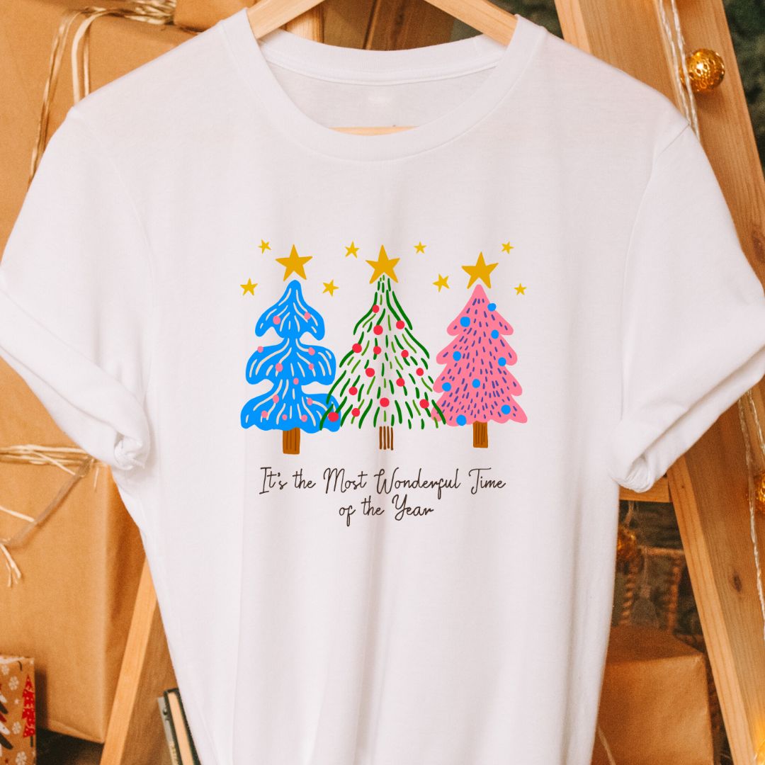 Elegant "Most Wonderful Time of the Year" Christmas t-shirt with sophisticated typography. Elegant "Most Wonderful Time of the Year" Christmas t-shirt with sophisticated typography.