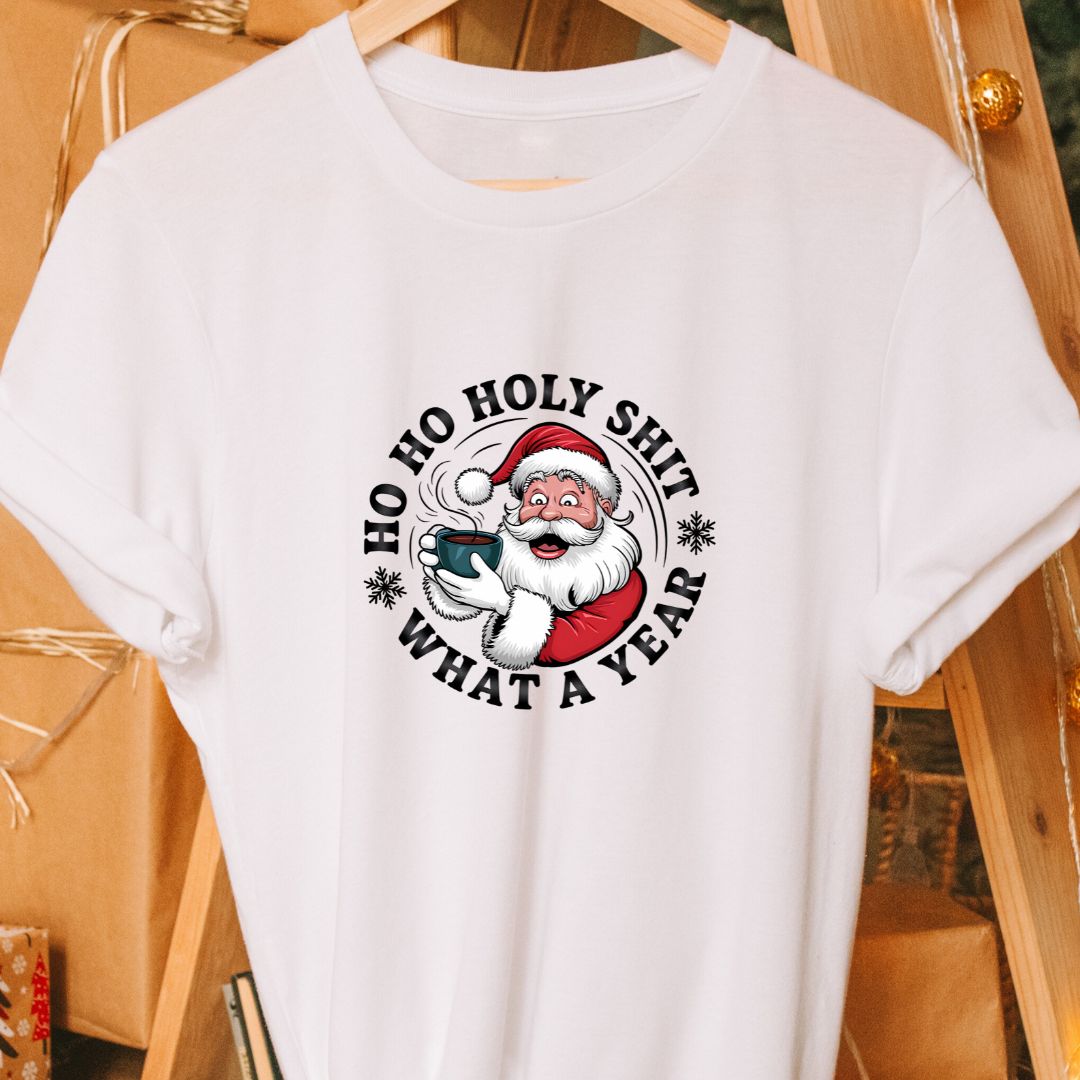 Funny Santa Claus t-shirt with "Ho Ho Ho Holy Shit What a Year" quote. Funny Santa Claus t-shirt with "Ho Ho Ho Holy Shit What a Year" quote.