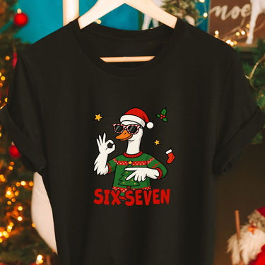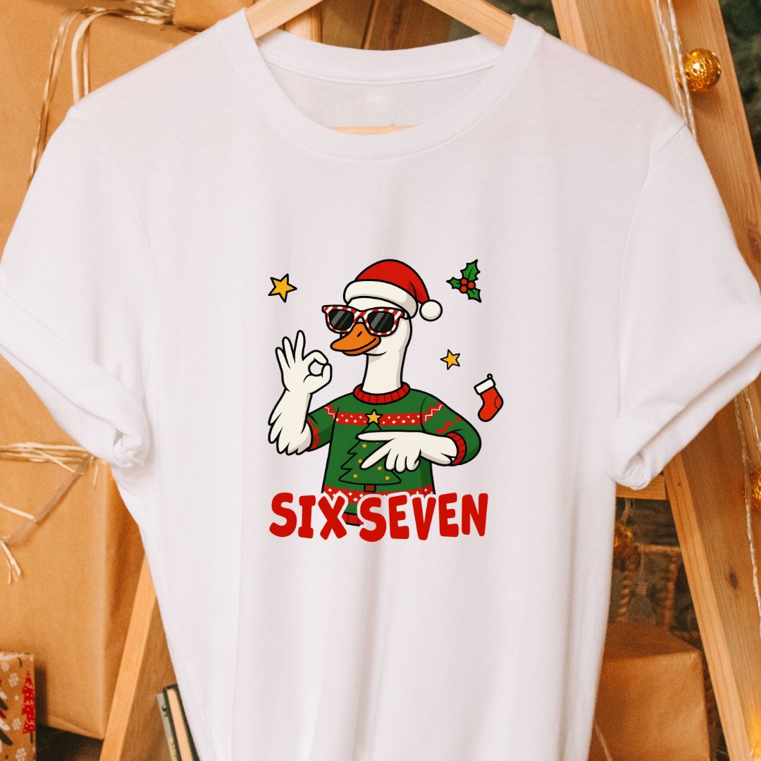 Capture holiday humor with a playful twist. This 100% cotton tee features a cheeky goose wearing a Christmas hat, mimicking a viral hand‑sign trend with a “6‑7” pose—perfect for anyone who loves meme culture wrapped in festive fun. The design is lighthearted and universally relatable: inspired by a viral hand-sign trend (keeps the reference accurate without naming specific generations).