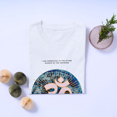 Empower your daily affirmations with our 'I Am Connected to the Divine Source' T-shirt, adorned with the sacred Om symbol. Ideal for those dedicated to daily positive affirmations and spiritual growth. Elevate your practice, shop now. #DailyAffirmation #OmSymbolTee #SpiritualWear #EmpowerYourself