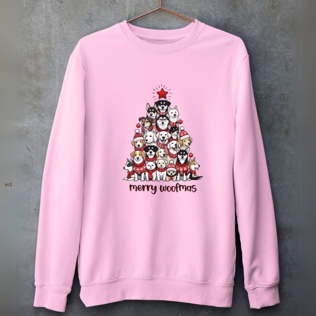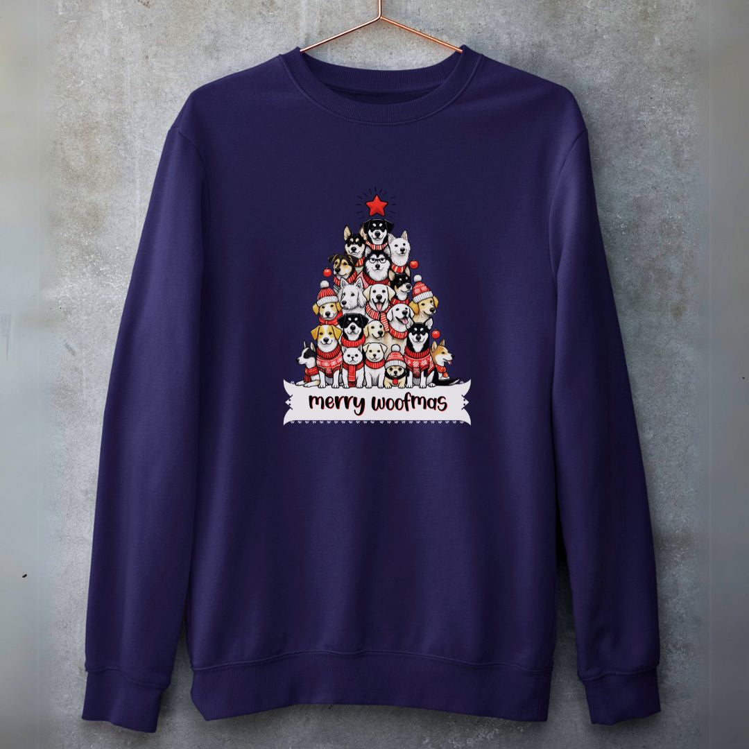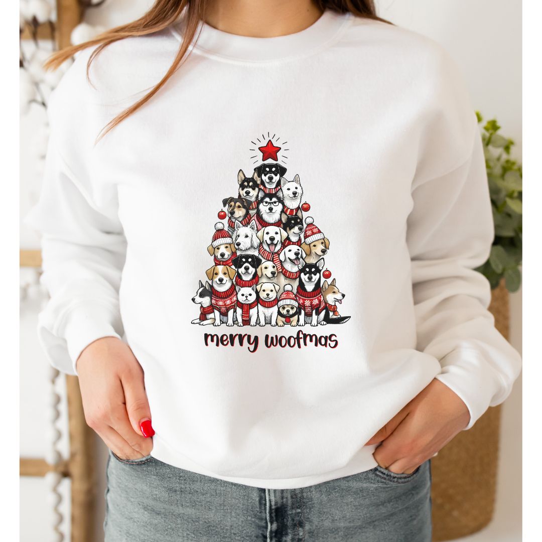 This premium quality sweatshirt features a unique 'Merry Woofmas' design with a Christmas tree made of cute puppies, perfect for dog lovers with a sense of humor. Cozy, stylish, and ideal for anyone who enjoys furry friends, Christmas, and a touch of wit. Great for gifts or personal holiday cheer!
